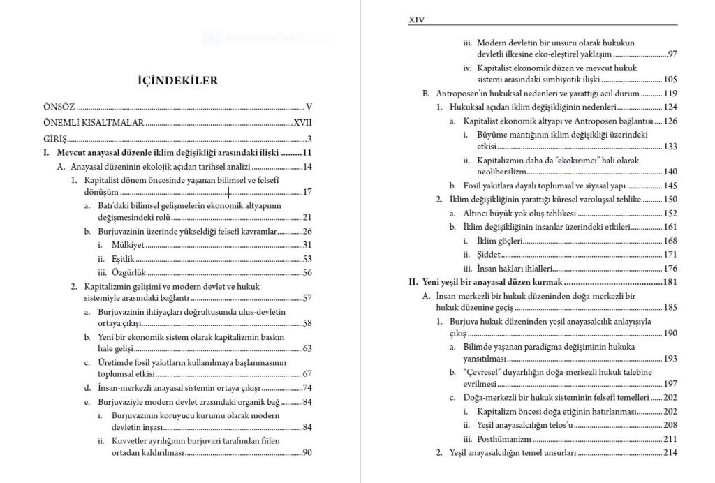 Bu çerçevede kitap, klasik bir anayasa hukuku kitabı değil, çok disiplinli bir çalışmanın ürünü. İçinde hukukun dışında tarih, siyaset, ekonomi ve biraz da fen bilimleri var. Elbette iklim değişikliğiyle bağlantılı olduğunu düşündüğüm ve bulabildiğim tüm anayasa hükümlerine ve anayasa mahkemesi kararlarına kitapta yer verdim. Ancak burası kitabın sadece son bölümünü oluşturdu. Öncesindeyse, bugünkü modern devletin üzerine kurulduğu kapitalist ekonomik düzeni ve iklim değişikliğiyle büyümeye dayalı bu düzen arasındaki ilişkiyi analiz etmeye çalıştım. Bu kısımda vardığım sonuç, iklim değişikliğinin çözümünün kapitalizm içerisinde bulunamayacağı oldu. Kitabın ikinci bölümündeyse, bu varoluşsal soruna ilişkin bir çözüm önerisi olarak “yeşil anayasalcılık” kavramını geliştirmeye çalıştım. Bu kavram, “ekolojik anayasa” olarak adlandırılan bazı anayasa metni değişikliklerinin ötesinde, içinde bulunduğumuz örgütlenme biçiminde yapısal dönüşümler öngören, iklim değişikliğine nede olan faaliyetlerin, yaşam hakkı çerçevesinde sınırlanması ve hatta engellenmesini amaçlayan ve bunu yaparken yaşam hakkını da insan-ötesine taşıyan bir anlayış. Son 30 yılda doğa bilimlerinde görülen dönüşümü hukuksal düzene yansıtma gayreti içerisinde olan bu yaklaşım, doğru bildiğimiz yanlışların sorgulanmasını ve değiştirilmesini hedefliyor. Bu çerçevede ikinci bölümde, sadece insanın değil, insanın da bir parçası olduğu doğanın merkezde olduğu; sürdürülebilirliğin temel ilke olarak algılandığı; hayvanların ve doğal varlıkların da hak öznesi olarak tanındığı; doğayla uyumlu bir ekonomik modelin temelini oluşturan ve iklim adaleti anlayışı üzerine kurulu bir anayasal düzenin nasıl kurulabileceğine ve bu konuda özellikle de yüksek mahkemelerin nasıl bir rol üstlenebileceğine/üstlenmesi gerektiğine dair düşüncelerimi aktardım.